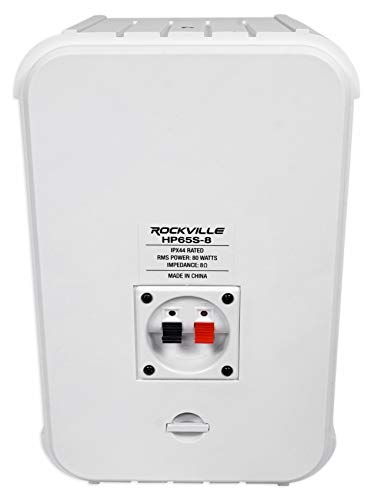 - Pair of Rockville HP65S-8 6.5" White 500 Watt Outdoor / Indoor Home Theater Speakers with Swivel Bracket . Peak Power Handling: 500 Watts (per pair). RMS Power Handling: 160 Watts (per pair). IPX44 rated to withstand, rain, wind, etc.