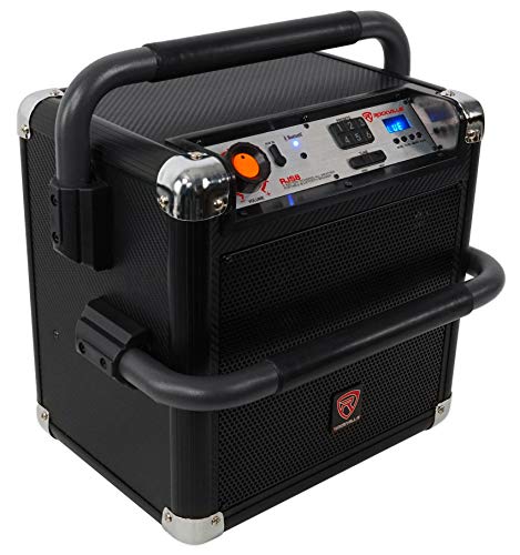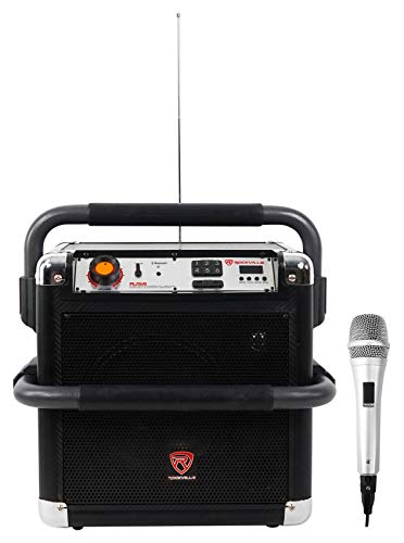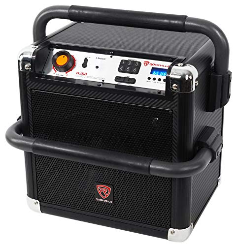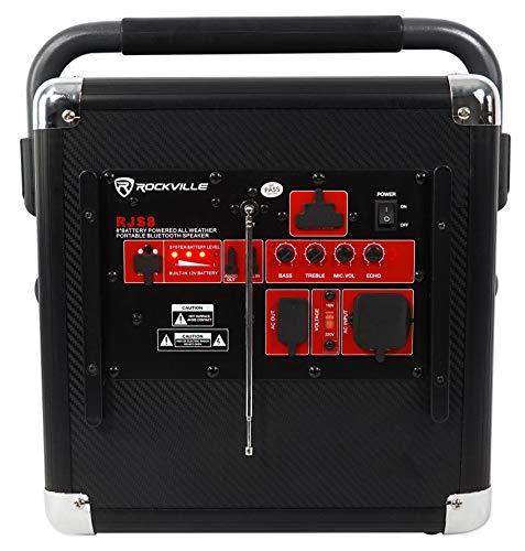 - Rockville RJS8 multi-purpose portable powered rechargeable Bluetooth speaker system+Mic. On-the-go system is perfect for job sites, tailgating, beach, home use, DJ use, and more. This system is versatile, packed with features, and has a lot of power! It goes super loud making it perfect for so many applications!. Rechargeable battery built in lasts 3 hours at max volume playback, and 5 hours on mid volume playback, and 6-7 hours at low level listening. Package includes wired microphone!